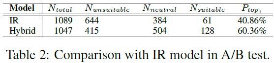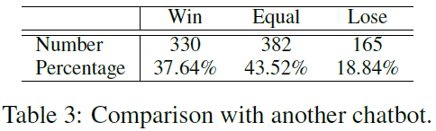 本文对结果做了详细的评估,首先评估了 rerank 模块平均概率的结果。然后分别对 IR,生成,IR+rerank,IR+rerank+ 生成这些不同组合的系统做了性能评测。并对该系统和 baseline 的 Chatbot 做了在线 A/B 测试。最后比较了这个系统和已经上市的 Chatbot 之间的差别。