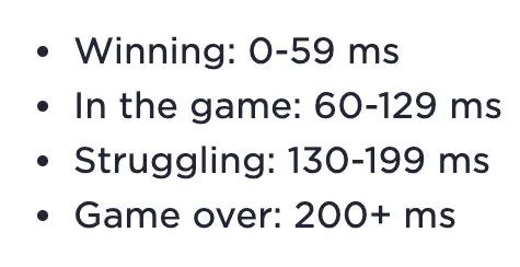 可以看到,稳赢的Ping值是0-59ms,「勉强挣扎」是130-199ms,