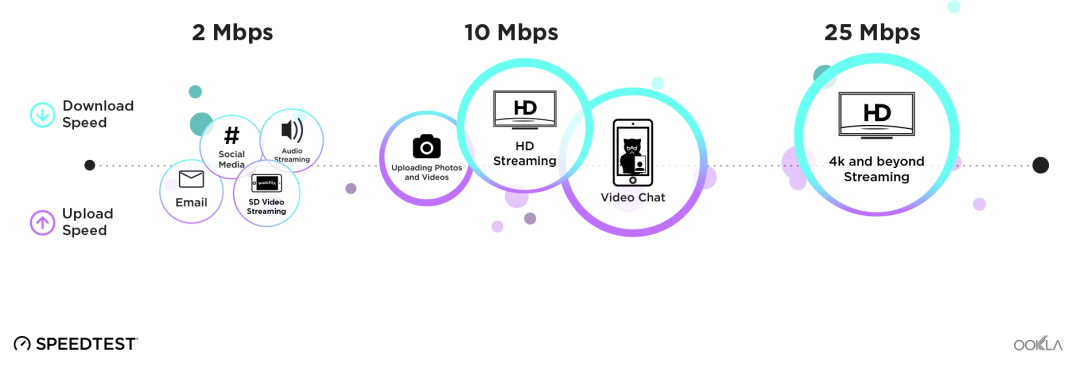 发邮件、社交媒体大约需要2Mbps,高清直播、视频通话等需要10Mbps,4K高清直播大概需要25Mbps。