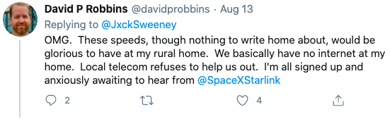 一位生活在农村的网友表示,他所处的地区基本上没有互联网,而当地的电信公司拒绝提供了帮助,很期待Starlink网络。