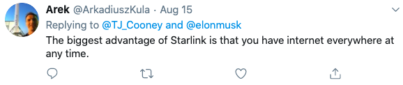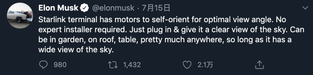 在7月的另一条推文中,马斯克提到「Starlink 终端有自我调整以获得最佳视角的能力 ,这样就不需要非常专业的安装员了。终端可以放在花园、屋顶、桌子,几乎任何地方,