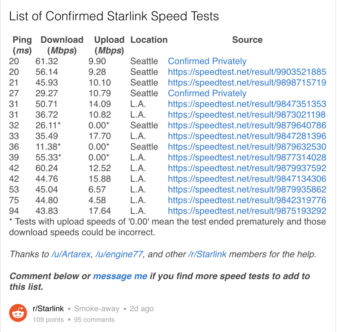 在Reddit的r/starlink话题下,有网友总结了新的Starlink测试速度,并制成了表格。(标记「*」且上传速度为「0.00」的测试,意味着测试过早结束,并且这些下载速度可能不正确。)