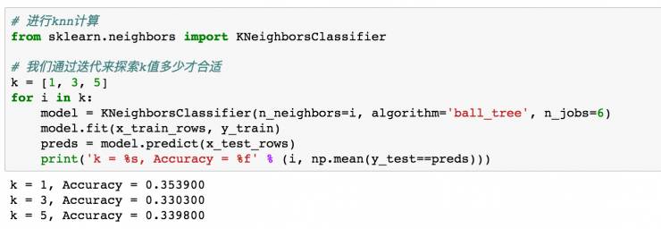 到此为止,我们已经对数据进行了预处理,下面就可以调用 KNN 来进行训练,我分别采用了 K=1,3,5 来看模型的效果。