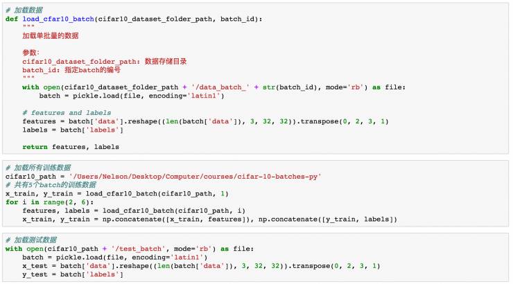 数据是被序列化以后存储的,因此我们需要使用 Python 中的 pickle 包将它们读进来。整个压缩包解压以后,会有 5 个 data_batch 和 1 个 test_batch。我们首先把数据加载进来: