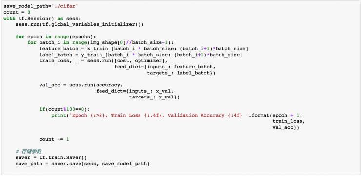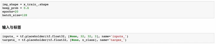 img_shape 是整个训练集的形状,为 [40000, 32, 32, 3],同时我们的输入形状是 [batch_size, 32, 32, 3],由于前面我们已经对标签进行了 one-hot 编码,因此标签是一个 [batch_size, 10] 的 tensor。