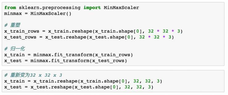 首先将训练数据集重塑为 [50000, 3072] 的形状,利用 minmax 来进行归一化。最后再将图像重塑回原来的形状。
