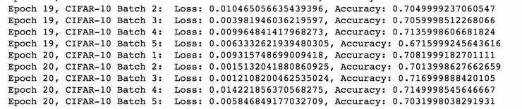 至此,我们实现了两种图像分类的算法。第一种是 KNN,它的思想非常好理解,但缺点在于计算量都集中在测试阶段,训练阶段的计算量几乎为 0,另外,它的准确性也非常差。第二种我们利用 CNN 实现了分类,最终的测试结果大约在 70% 左右,相比 KNN 的 30% 准确率,它的分类效果表现的相当好。当然,如果想要继续提升模型的准确率,就需要采用其他的一些手段,如果感兴趣的小伙伴可以去看一下相关链接(http://rodrigob.github.io/are_we_there_yet/build/classification_datasets_results.html#43494641522d3130) 里的技巧,Kaggle 上的第一名准确率已经超过了 95%。