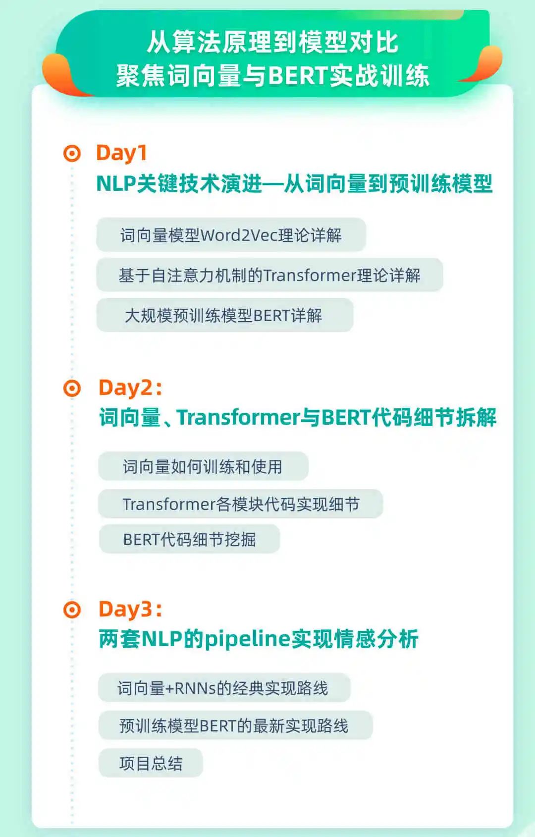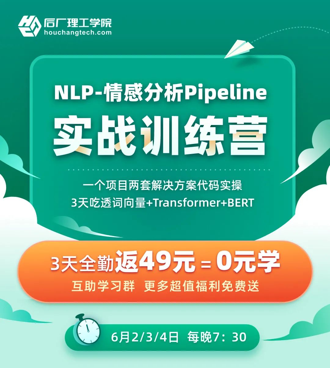为期 3 天的《NLP-情感分析Pipeline实战训练营》,带你3天吃透词向量+Transformer+BERT。