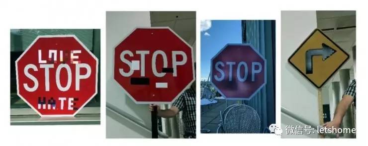宅客频道发现,在左边第一张图的场景中(标志上写有“love”和“hate”的),自动驾驶汽车会将停止标志认成“限速 45 英里/小时”),而且一骗一个准。