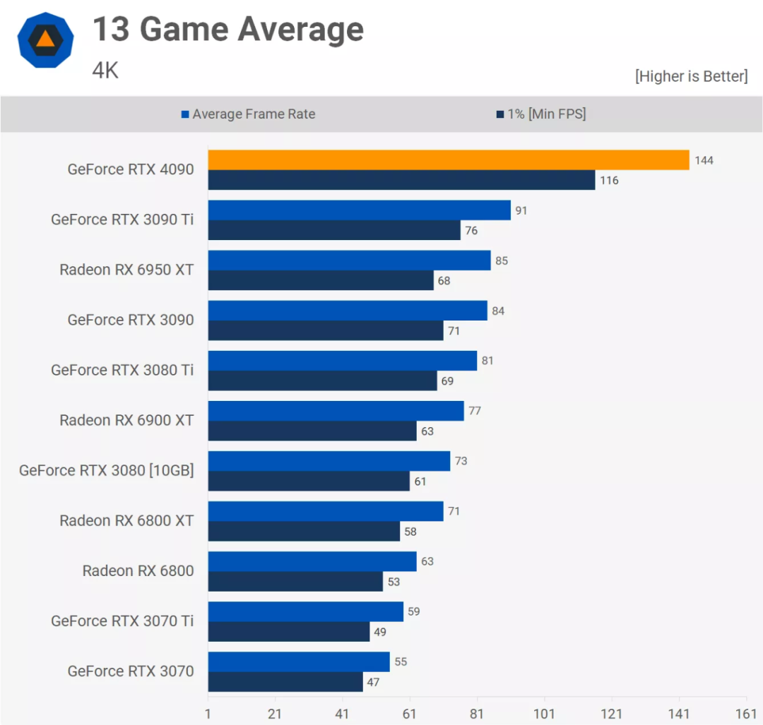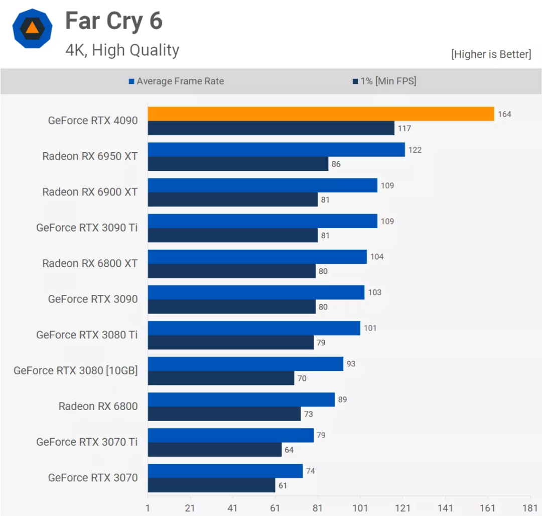 转换成 4K 分辨率后,RTX 4090 带来了巨大的性能增益,平均刷新率是 164 fps,比 6950 XT 提升了 34%,提升幅度较大,相比于 RTX 3090 Ti 的提升幅度则更大,达到了 50%,比标准 3090 甚至提升了 60%。
