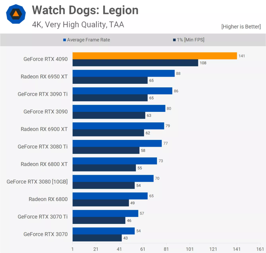 在「看门狗:军团」(1440p)的游戏测试中,GeForce RTX 4090 似乎并不是非常惊艳的,但它确实是目前为止最快的 GPU——比 6950 XT 提速了约 9%。
