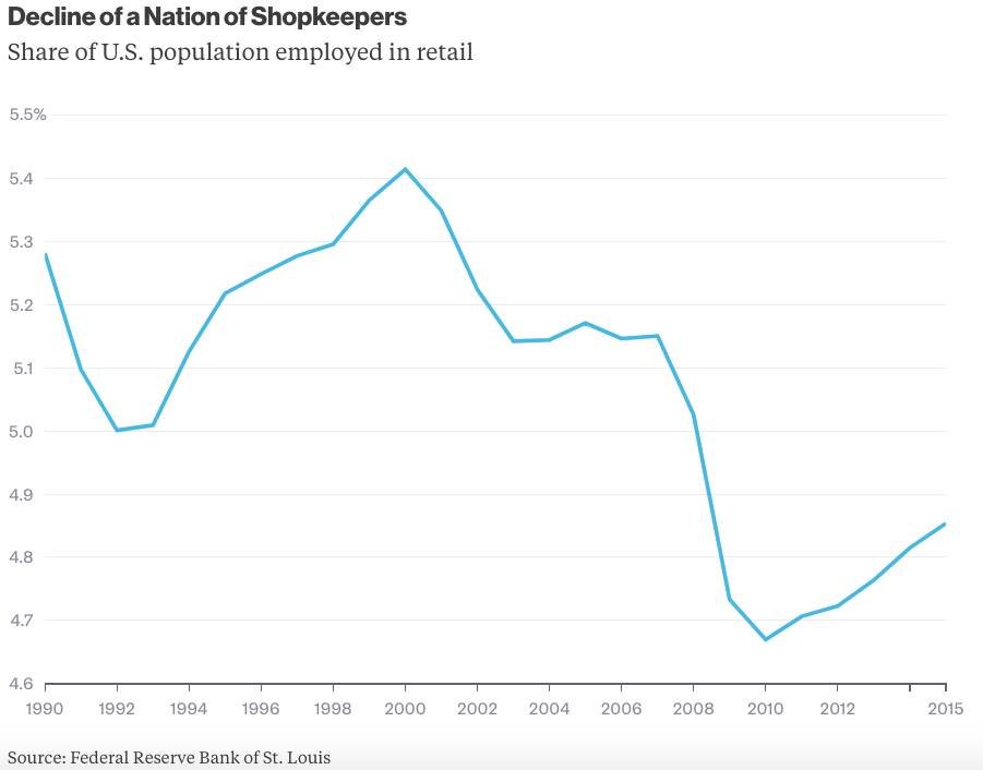 零售业岗位变得越来越少,供职零售业的人口比例也逐渐降低