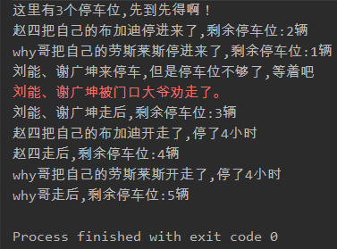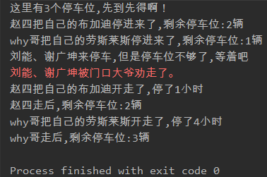 跑起来,结果也正确,所有车都走了后,停车位还是只有 3 辆: