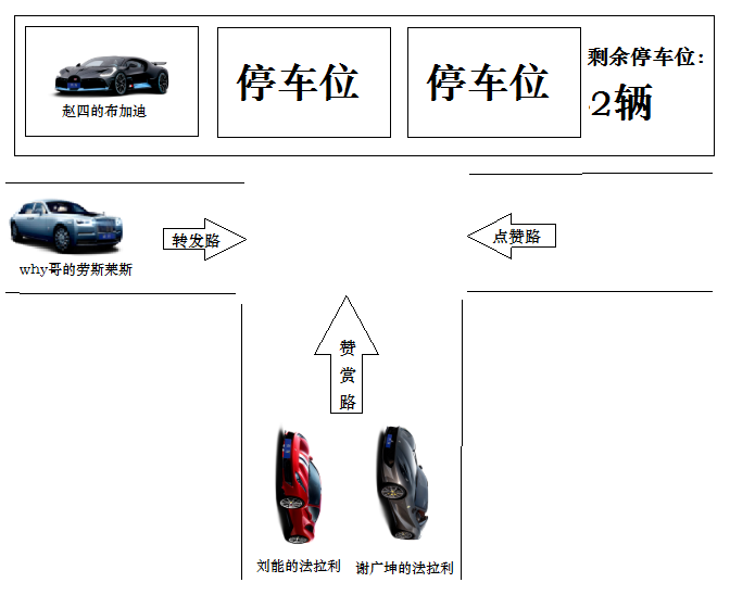 我们还是带入之前停车的场景。假设赵四和我先把车停进去了,这个时候刘能、谢广坤他们来了,发现车位不够了,两个好基友嘛,就等着,非要停在一起: