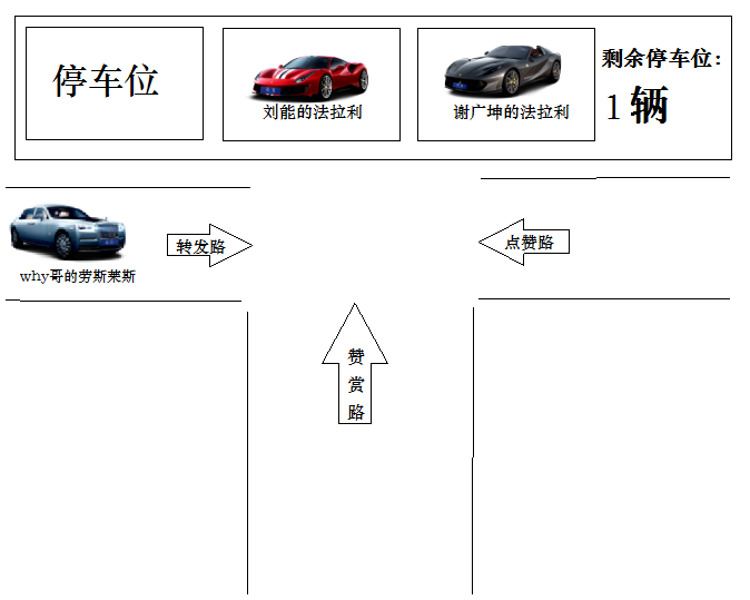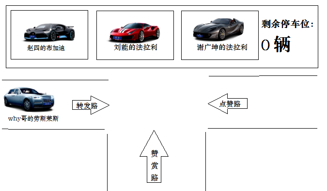在上面这个场景中就是:赵四的布加迪开进去停车后,后面刘能、谢广坤的法拉利和我的劳斯莱斯都停不进去了。