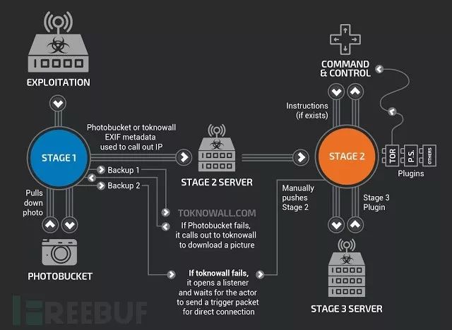 与其他针对物联网设备的恶意软件不同,第 1 阶段的恶意软件在设备重新启动后依然存在。阶段 1 的主要目的是获得持久的立足点,并部署第 2 阶段的恶意软件。阶段 1 利用多个冗余命令和 C2 机制去寻找阶段 2 部署服务器的 IP 地址。第 2 阶段的恶意软件主要用于情报收集(文件收集、命令执行、数据泄露和设备管理等)。这一阶段部分版本可以自动损毁,覆盖设备固件的关键部分并重新启动设备,导致设备无法使用。第二阶段的模块主要是支持第 3 阶段的插件,第 3 阶段插件可以监听网络数据包并拦截流量;监视 Modbus SCADA 协议并通过 Tor 网络与 C&C 服务器通信。