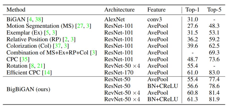 表2:在官方ImageNet验证集上对BigBiGAN模型与最近的基于监督式逻辑回归分类器的其他方法的对比。