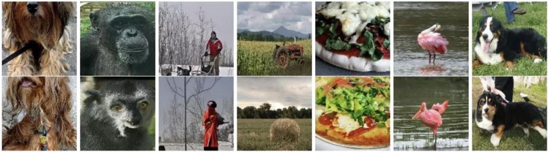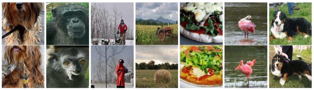 图2:从无监督的BigBiGAN模型中选择的图像重建结果。上面一行的图像是真实图像(x~Px),下面一行图像是由G(E(x))计算出的这些图像的重建结果。与大多数显式重建成本(例如像素数量)不同,由(Big)BiGAN 实现隐式最小化的重建成本更多倾向于强调图像的语义及其他更高级的细节。