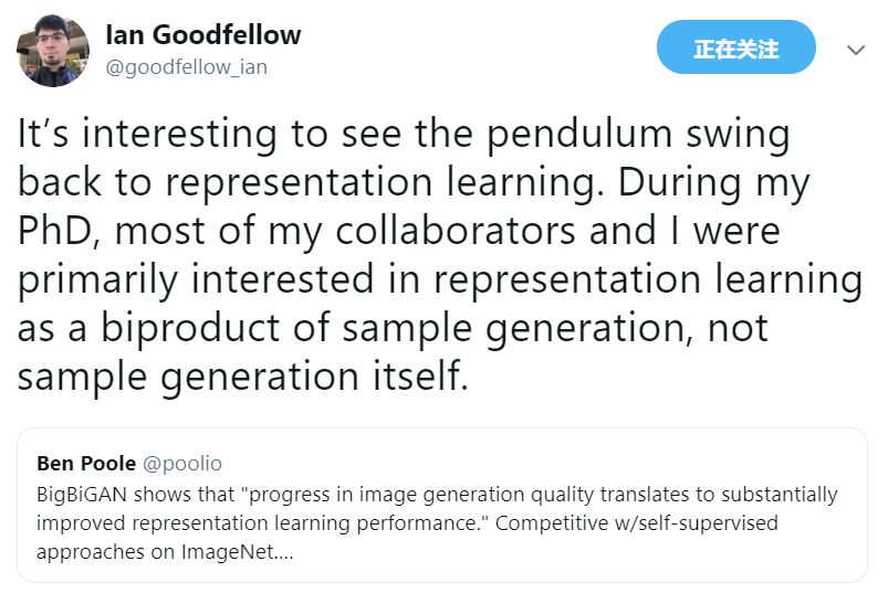 Goodfellow说:“当年我们在写最初的GAN论文时,我的合著者@dwf(David Warde-Farley)试图得到一些类似于BiGAN的东西,用于表示学习。5年后看到这一成果,我觉得太酷了。”