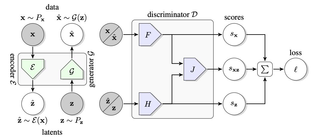联合判别器D用于计算损失l。其输入是data-latent pairs,可以是从数据分布和编码器