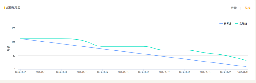 在工程师编码的过程中,研发负责人和产品经理都会随时通过`燃尽图`来关注迭代的进度,并在每日站会中沟通进展。