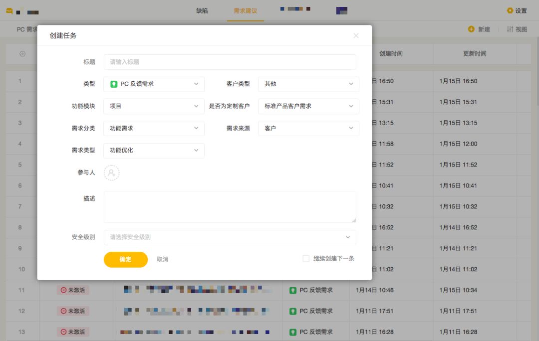管理需求的第一步首先是要进行需求的收集。我们的需求来源除了产品经理自己通过市场调研等各种渠道分析出的需求,来自用户的需求、建议、缺陷,都是由销售、客户成功的同事在一个公开的项目公共Backlog中提交,然后产品经理和设计师会定期对需求池的需求进行评审处理;