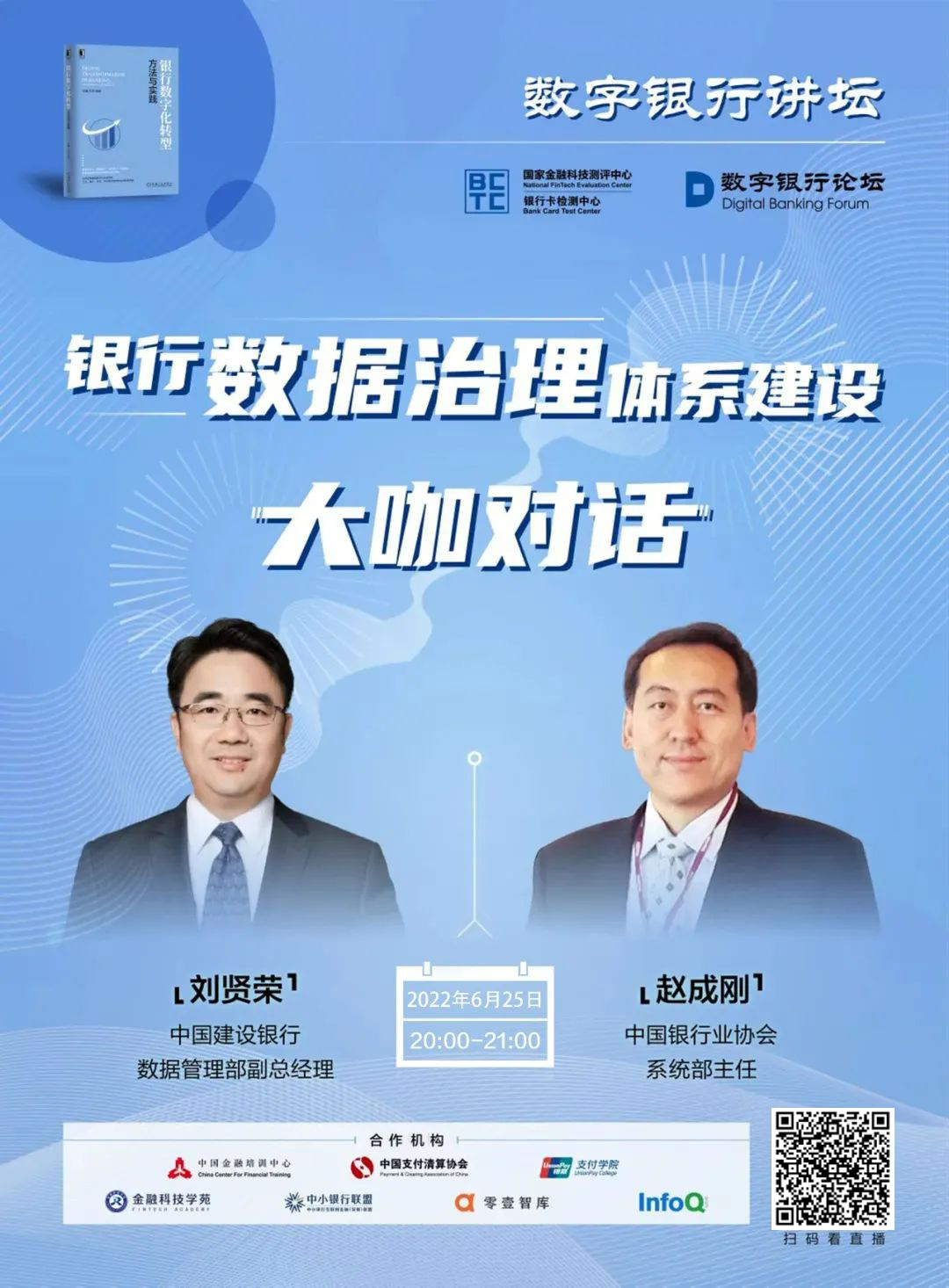 有鉴于此,国家金融科技测评中心(银行卡检测中心)联合数字银行论坛(银行数字化转型课题组)共同发起数字银行讲坛,以新书《银行数字化转型:方法与实践》及之前出版的《银行数字化转型:路径与策略》两本书中几十个银行实战案例为主线,邀请作者和专家以对话的形式,讲述转型实践,分享经验和方法,探讨难点问题解决之道,从行业层面解答银行关心的实战问题,以期对银行的数字化转型有所助益,共同推动金融服务数字经济的战略目标。