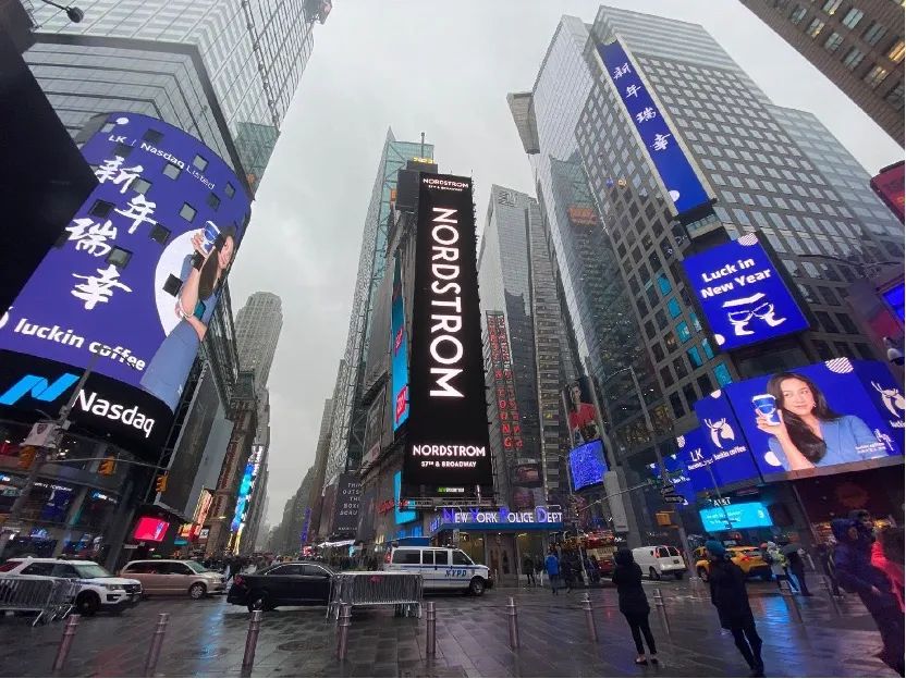 图源:纽约时间2020年1月3日,瑞幸登上美国时代广场纳斯达克大屏