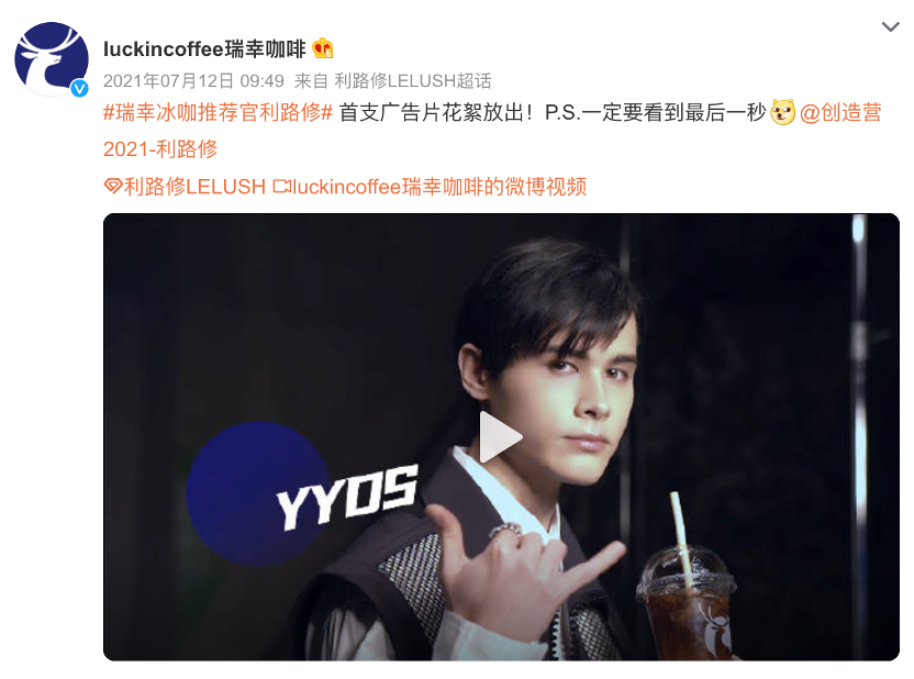 先是2021年4月配合生椰系列在微博上用产品经理玩梗,随后五月初签下当时正火的利路修成为瑞幸冰咖推荐官,配合发布广告片《瑞幸YYDS!》,BGM和洗脑式出现的“YYDS”,正中年轻消费者下怀。