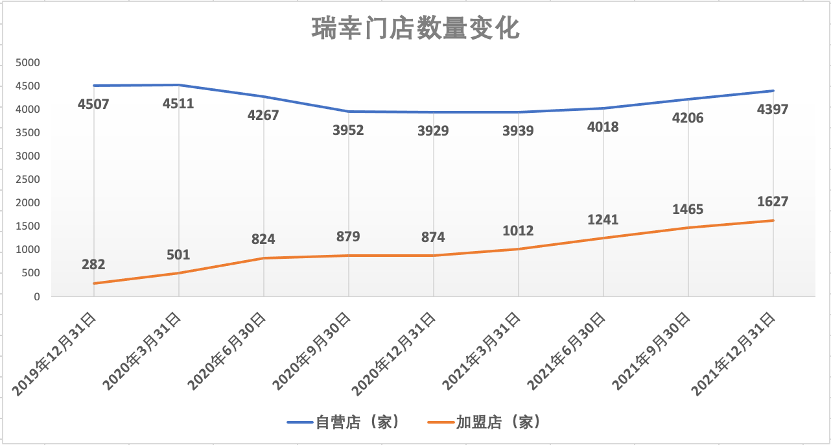 财报显示,2021年,瑞幸净新开门店数1221家,门店数量同比增长25.4%。截至2021年末,瑞幸共有6024家门店,其中4397家为自营门店,占比73%;1627家为加盟门店,占比27%,正式超越星巴克成为中国门店数最多的连锁咖啡品牌,而后者截至2022年1月在中国市场的门店总数5557家。