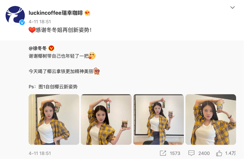 连续造势三天后,4月11日,瑞幸发布新品“椰云拿铁”,并公布了2款限定纸袋和1款杯套。同时,椰树代言人徐冬冬发博制造话题,设计师潘虎则发文表示:“不装了,是我干的!”