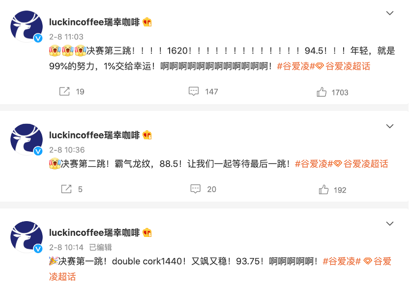 凤凰网《风暴眼》粗略统计发现,从2月1日至2月22日,涵盖整个冬奥会期间,瑞幸共计发布了有关谷爱凌的微博多达49条,其中谷爱凌夺得首枚金牌当日,瑞幸更是在微博上实时跟进谷爱凌的最新比赛进展,刷屏速度堪比文字直播。