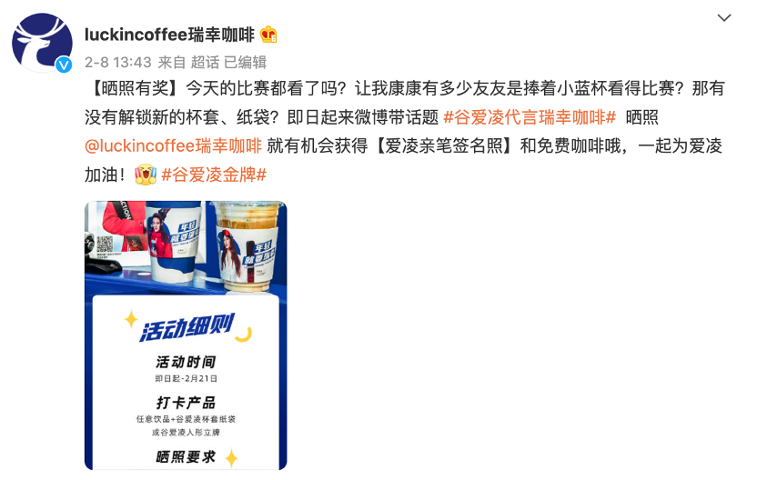 2021年9月,在冬奥会举办前5个月,瑞幸宣布签约谷爱凌为品牌代言人,并推出谷爱凌定制新品。