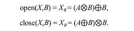 由于噪声的影响,图像在阈值化后所得到的边界往往是很不平滑的,物体区域具有一些噪声孔,背景区域上散布着一些小的噪声物体,对分割后的图像进行图像形态学开闭运算处理,用来消除小物体、在纤细点处分离物体、平滑较大物体的边界,同时并不明显改变其面积。腐蚀操作会去掉物体的边缘点,细小物体所有的点都会被认为是边缘点,因此会整个被删去。再做膨胀时,留下来的大物体会变回原来的大小,而被删除的小物体则永远消失了。膨胀操作会使物体的边界向外扩张,如果物体内部存在小空洞的话,经过膨胀操作这些洞将被补上,因而不再是边界了。再进行腐蚀操作时,外部边界将变回原来的样子,而这些内部空洞则永远消失了[12]。开运算和闭运算的运算规则如下: