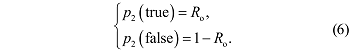 本文定义辨识框架为 U={true,false},记连通区域面积比 R_A、垂直方向重叠率为 R_O,辨识框架下的 2 个命题分别为 A_1、A_2,其相应的证据概率函数为 p_1、p_2,两连通区域面积比接近 1 的时候,连通区域属于同一车辆的概率比较大,垂直方向重叠率越接近 1,两连通区域在同一水平的概率越大,因此两个命题的基本概率函数值由下式确定: