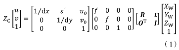 式中:( XW, YW, ZW, 1 )^T 是点的世界坐标,与其对应的摄像机齐次坐标是 ( XC, YC, ZC, 1 )^T,dx 与 dy 分别表示每个像素在横、纵轴上的物理单位下的大小,f 是摄像机的焦距,s' 表示因摄像机成像平面坐标轴相互不正交引出的倾斜因子(Skew Factor),R 代表旋转矩阵(为一个 3×3 的正交单位矩阵),t 代表平移向量,I 是元素全为 1 的对角矩阵,O=(0, 0, 0)^T。