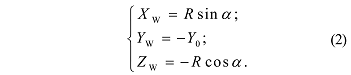 毫米波雷达获取的前方障碍物信息是在极坐标下的二维信息,将障碍物 P 的极坐标下的二维信息转换到直角坐标系中,雷达坐标系的 X0O0Z0 平面与世界坐标系的 XOZ 平面平行,两平面之间的距离为 Y0,通过雷达可以得到前方车辆中心点投影到雷达扫射平面内的点 P 相对雷达的距离 R 和角度 α,确定点 P 在世界坐标系下的坐标,转换关系如下: