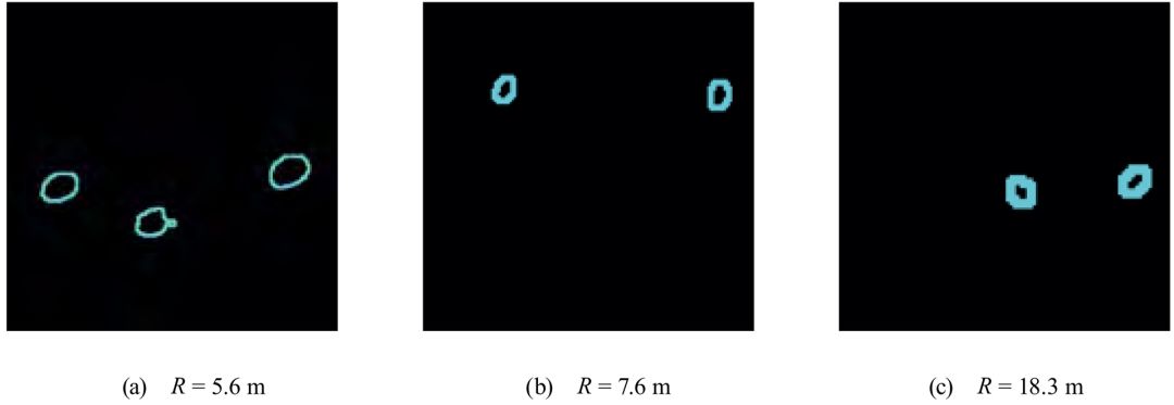 雷达扫描图如图 2 所示。雷达坐标系中的目标经坐标转换关系在图像上形成的感兴趣区域如图 3 中的 (a) 列所示。动态感兴趣区域的大小会随目标的距离发生变化,以更适合的尺寸截取感兴趣区域图像进行下一步检测验证,缩小了检测范围,从而减少计算量提高检测实时性。获取的感兴趣区域图像如图 3b 列所示。