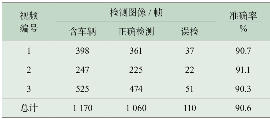 经统计部分视频数据并与人员主观判断比较,其中包含车辆图像共 1170 帧,识别出车辆尾灯的图像共 1060 帧,准确率达 90.6%。因此,本文方法在夜间环境下具有较好的检测效果;车辆所处环境的光照条件较差,存在路灯、地面反光等干扰光源,且路灯与车灯相似,但检测系统仍可以准确识别车辆尾灯,标记出车灯位置。