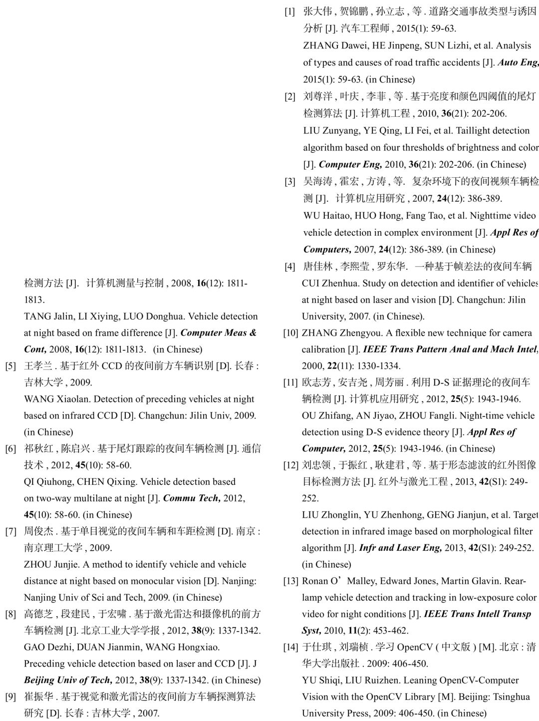 道路交通事故中由追尾相撞导致的事故占很大比例,而夜间交通事故尤为严重,约占交通事故总数的 40%。夜间车辆检测技术已成为智能车辆安全辅助驾驶系统的重要组成部分,用于准确地识别夜间前方车辆,为驾驶员及时提供前方车辆信息及路况,降低夜间交通事故的发生 [1]。