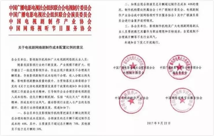 中国广播电影电视社会组织联合会电视制片委员会、中国广播电影电视社会组织联合会演员委员会、中国电视剧制作产业协会、中国网络视听节目服务协会联合发布《关于电视剧网络剧制作成本配置比例的意见》。