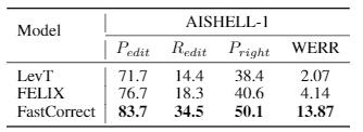 图一:FastCorrect 和基线方法的错误检测率和错误改正率对比