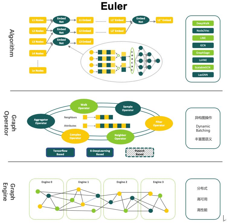 Euler系统整体可以分为三层:最底层的分布式图引擎,中间层图语义的算子,高层的图表示学习算法。