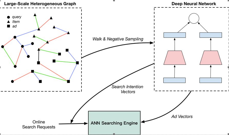 我们首先使用一些传统的挖掘算法,从用户行为日志、内容属性等维度挖掘出Query(查询词), Item(商品)和Ad(广告)的多种关系,然后利用Euler平台的LsHNE方法学习图中节点的embedding,这里节点embedding后的空间距离刻画了原来图中的关系,对于在线过来的请求通过计算用户查询词向量、前置行为中节点向量和广告节点向量之间的距离进行高效的向量化最近邻检索,可以快速匹配到符合用户意图的广告。图2展示了LsHNE方法的离线和在线流程。图3展示了样本构造和网络结构示意。