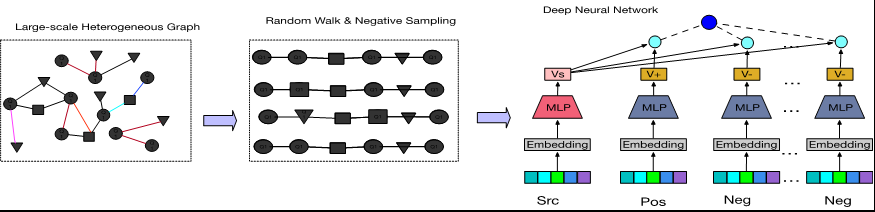 LsHNE是我们结合阿里妈妈搜索广告场景创新地提出一种无监督的大规模异构网络embedding学习方法。区别于DeepWalk类算法,LsHNE的特点包括:a) 采用深度神经网络学习表达,可以有效融合Attribute信息;b)考虑embedding表示的距离敏感需求,提出两个负采样原则:分布一致性原则和弱相关性原则;c)支持异构网络。