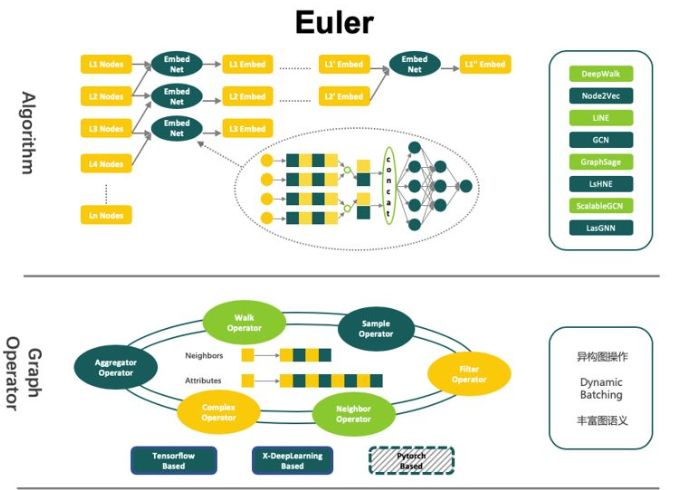 首先,Euler分布式图引擎提供了C++的API来提供所有图操作。基于这个API,我们可以方便的基于某个深度学习框架添加图操作的算子,从而利用Euler C++接口访问底层图引擎的能力。我们支持广泛使用的深度学习框架,比如阿里巴巴的X-DeepLearning与流行的TensorFlow。后继我们也会考虑支持其它的深度学习框架,比如PyTorch。