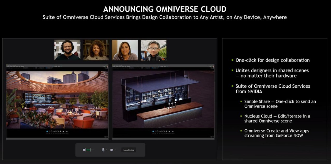 比如下图中远程工作的几位设计师在网络会议中使用 Omniverse View 来评审项目,他们可以连接彼此,并唤出一个 AI 设计师。也即是,他们通过 Omniverse Cloud 协作创建了一个虚拟世界。