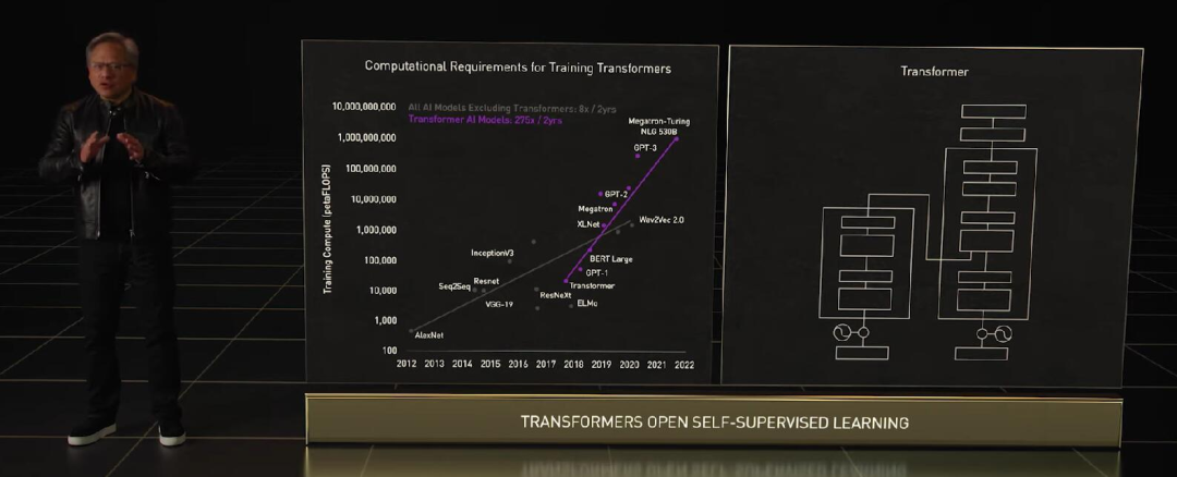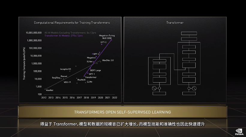 Transformer 类预训练模型是当前 AI 领域里最热门的方向,英伟达甚至以此为目标专门优化 H100 的设计,提出了 Transformer Engine,它集合了新的 Tensor Core、FP8 和 FP16 精度计算,以及 Transformer 神经网络动态处理能力,可以将此类机器学习模型的训练时间从几周缩短到几天。