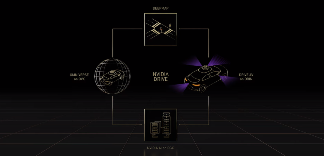 DRIVE 自动驾驶汽车系统本质上是「AI 司机」。与其他平台一样,NVIDIA DRIVE 是全栈式端到端平台,对开发者开放,他们可以使用整个平台或者其中一部分。在运行过程中,英伟达使用 DeepMap 高清地图等收集和生成真值数据,使用 DGX 上的 NVIDIA AI 来训练 AI 模型。Omniverse 中的 DRIVE Sim 在 OVX 上运行,它属于数字孪生。DRIVE AV 是一款运行在车载 Orin 计算平台上的自动驾驶应用。