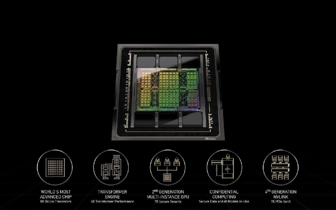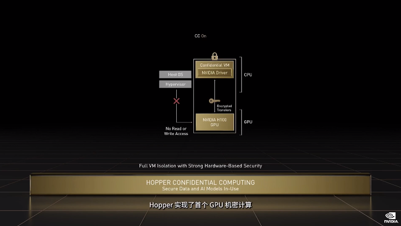 针对服务器实际应用,H100 也可以虚拟化为 7 个用户共同使用,每个用户获得的算力相当于两块全功率的 T4 GPU。而且对于商业用户来说更好的是,H100 实现了业界首个基于 GPU 的机密计算。